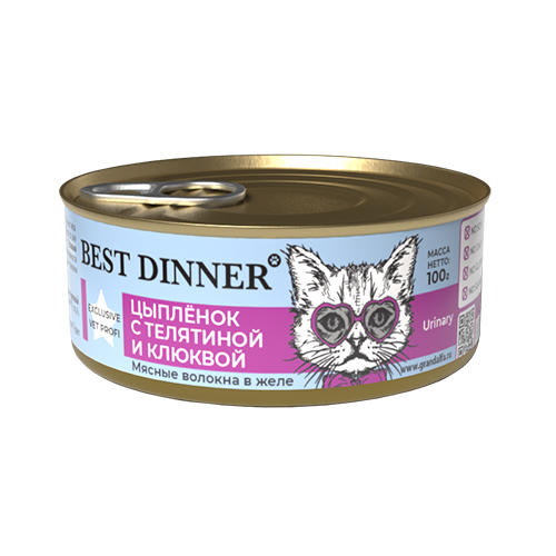 Крупные мясные волокна в желе для профилактики мочекаменной болезни. Клюква особенно необходима для кастрированных котов и стерилизованных кошек, у которых высок риск заболеваний выделительной системы. Телятина – ценное мясо: она богата протеинами, многочисленными витаминами и аминокислотами. Кошки любят телятину за нежные и мягкие волокна, тонкий мясной аромат и приятное чувство насыщения. Цыпленок - источник полноценного животного белка, необходимого для восстановления мышц, кроветворения и других жизненно важных функций; коллагена и эластина, поддерживающих здоровье суставов. Являясь диетическим мясом, он не позволит кошке набрать лишний вес, не перегрузит ее пищеварение и почки. Дрожжи полезны для кожи и шерсти, работы желудка и кишечника, укрепляют иммунитет. Таурин - незаменимая аминокислота, которая важна для здоровья глаз, шерсти, органов пищеварения, мочеполовой и репродуктивной систем. Юкка Шидигера снижает запах из лотка и выводит токсины из организма. Большое содержание влаги необходимо для правильного функционирования выделительной системы. Позаботьтесь о здоровье любимца вместе с Best Dinner!