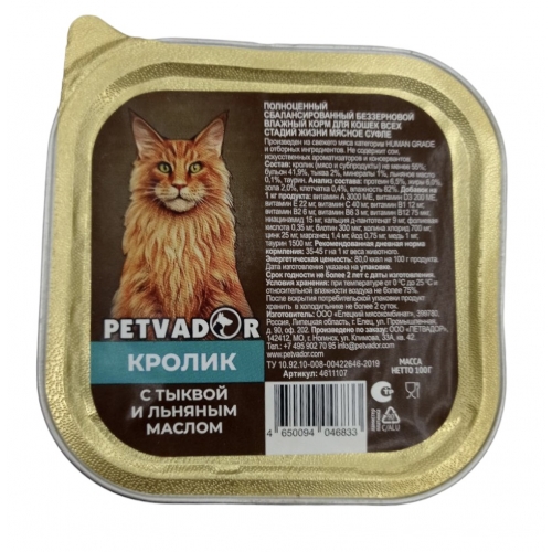 Petvador ламистр для котят и кошек кролик/тыква/льняное масло 100г